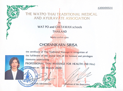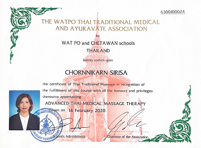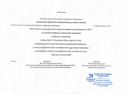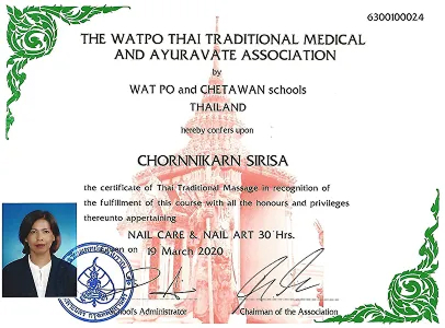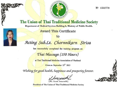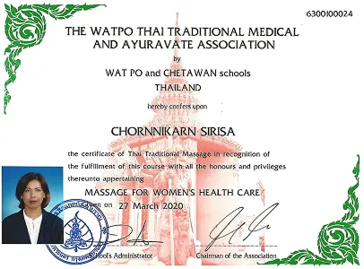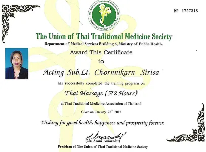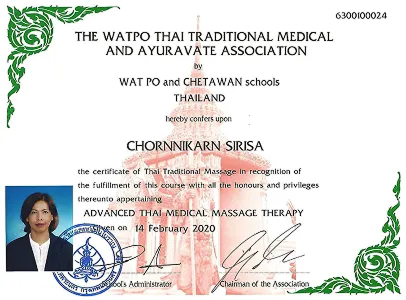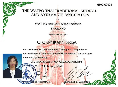 Installée en France depuis 2000, Sirisa, fondatrice de SAO Thai Massage, a d'abord exercé dans la restauration à Cholet. Confrontée à des douleurs chroniques aux mains et au cou, elle découvre les bienfaits de la médecine traditionnelle thaïlandaise et décide de se former à la source : l'école WATPO en Thaïlande. Diplômée en 2015, elle approfondit ensuite son expertise à travers de nombreuses formations pour maîtriser l'ensemble des techniques du massage traditionnel.